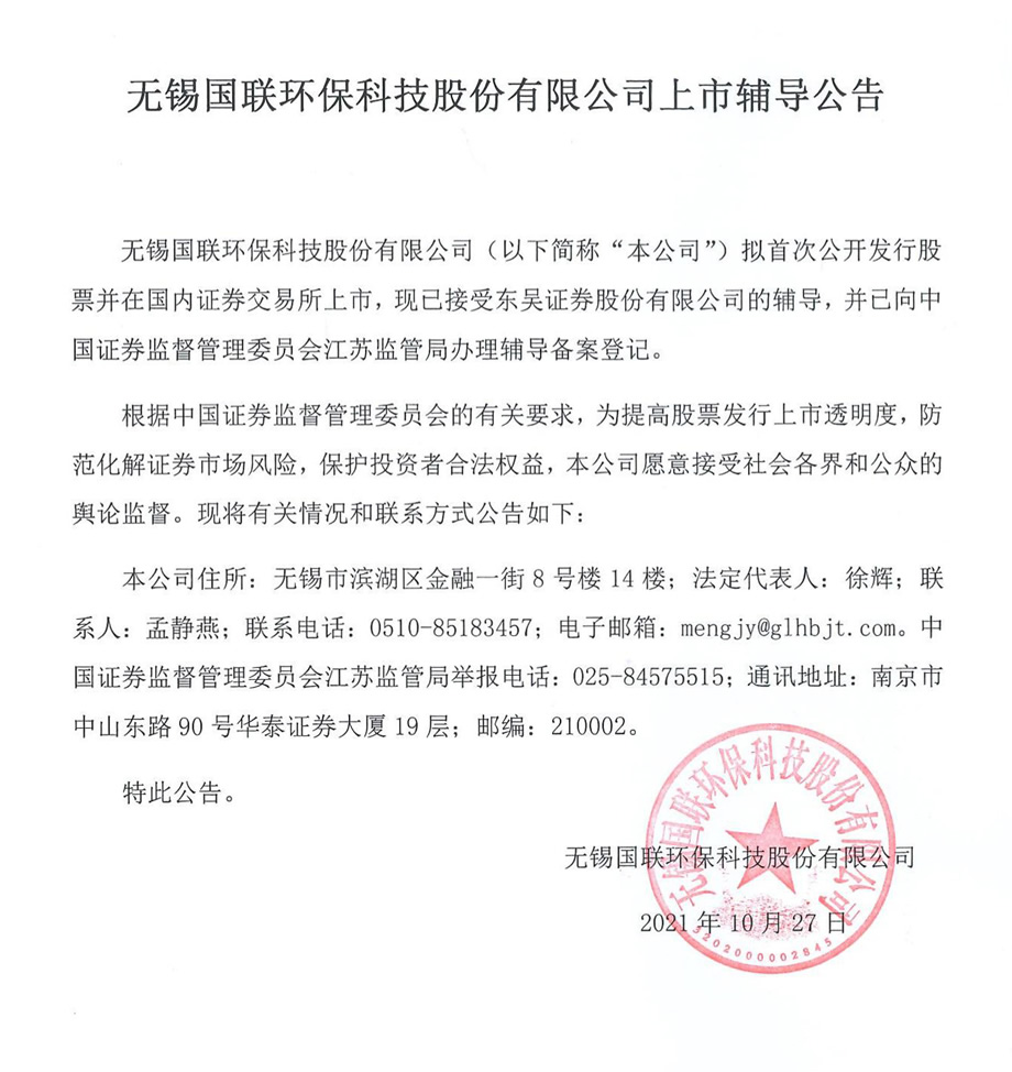 無錫國(guó)聯(lián)環(huán)??萍脊煞萦邢薰境闪⒂?011年1月27日,是一家以污泥減量化、無害化、資源化處置為產(chǎn)業(yè)化發(fā)展的國(guó)有控股企業(yè),股本為109,470,852元。